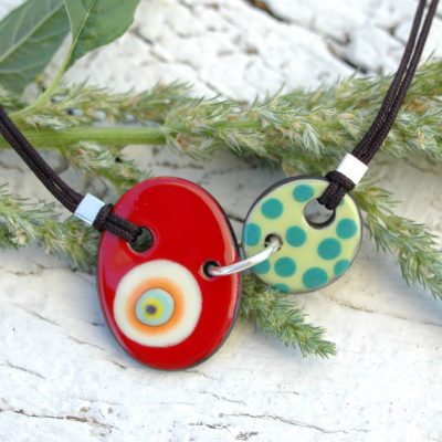 Esta bonita gargantilla ajustable lucirá original en tu escote. Me gusta combinar el color rojo y verde creando un estilo fresco e innovador. Ligera y cómoda, podrás llevarla a diario pues su tamaño es ideal. Esta joya está compuesta por dos piezas de cerámica , una más grande y roja de estilo psicodélico junto con una verde de lunares muy mediterráneos, ambas están unidas por una anilla de plata de Ley. El cordón es de nylon duradero y su cierre es ajustable mediante una bola de plata que se desliza fácilmente. Cada extremo del cordón tiene una pequeña bolita de plata hipoalergénica. Creativa, pintada a mano y muy exclusiva.