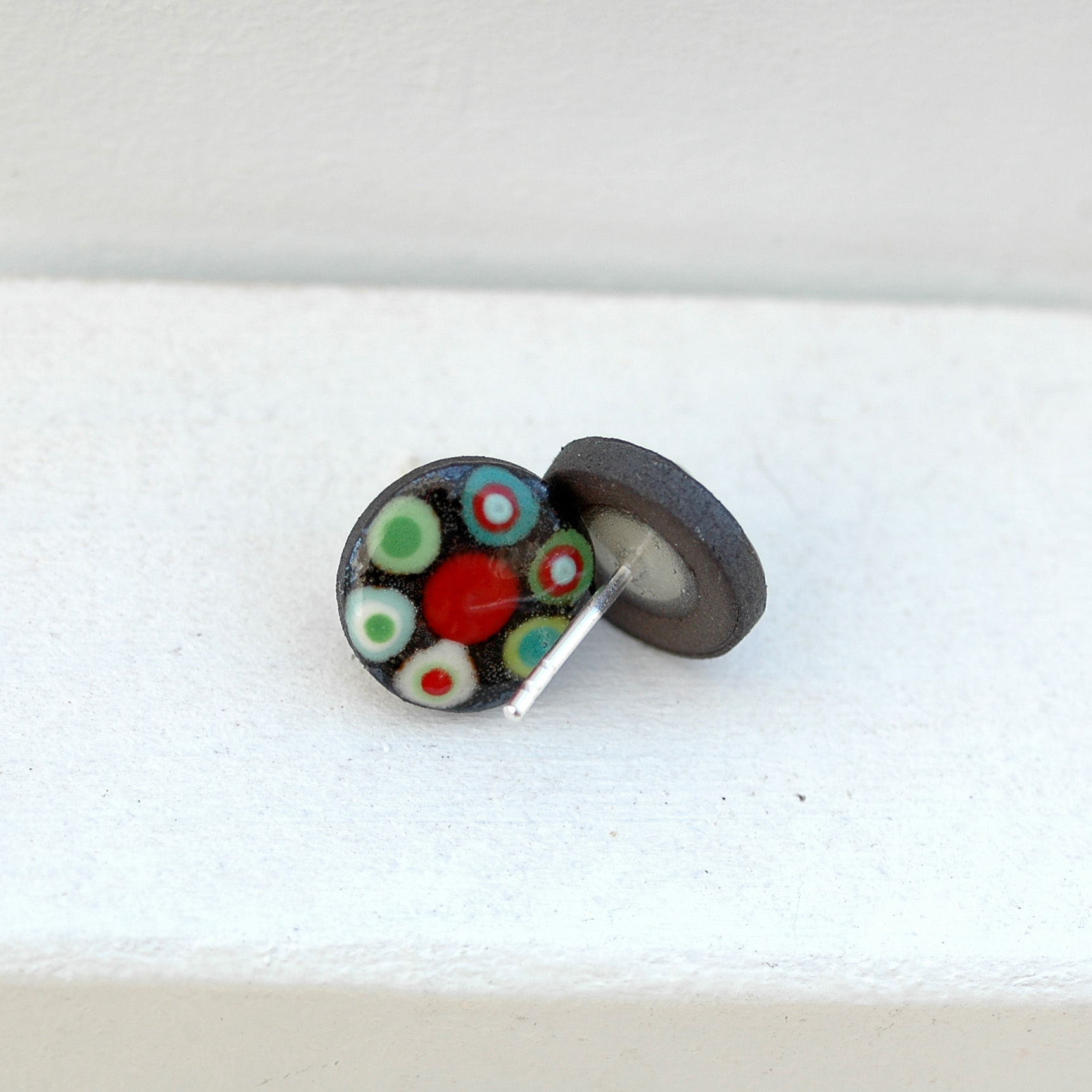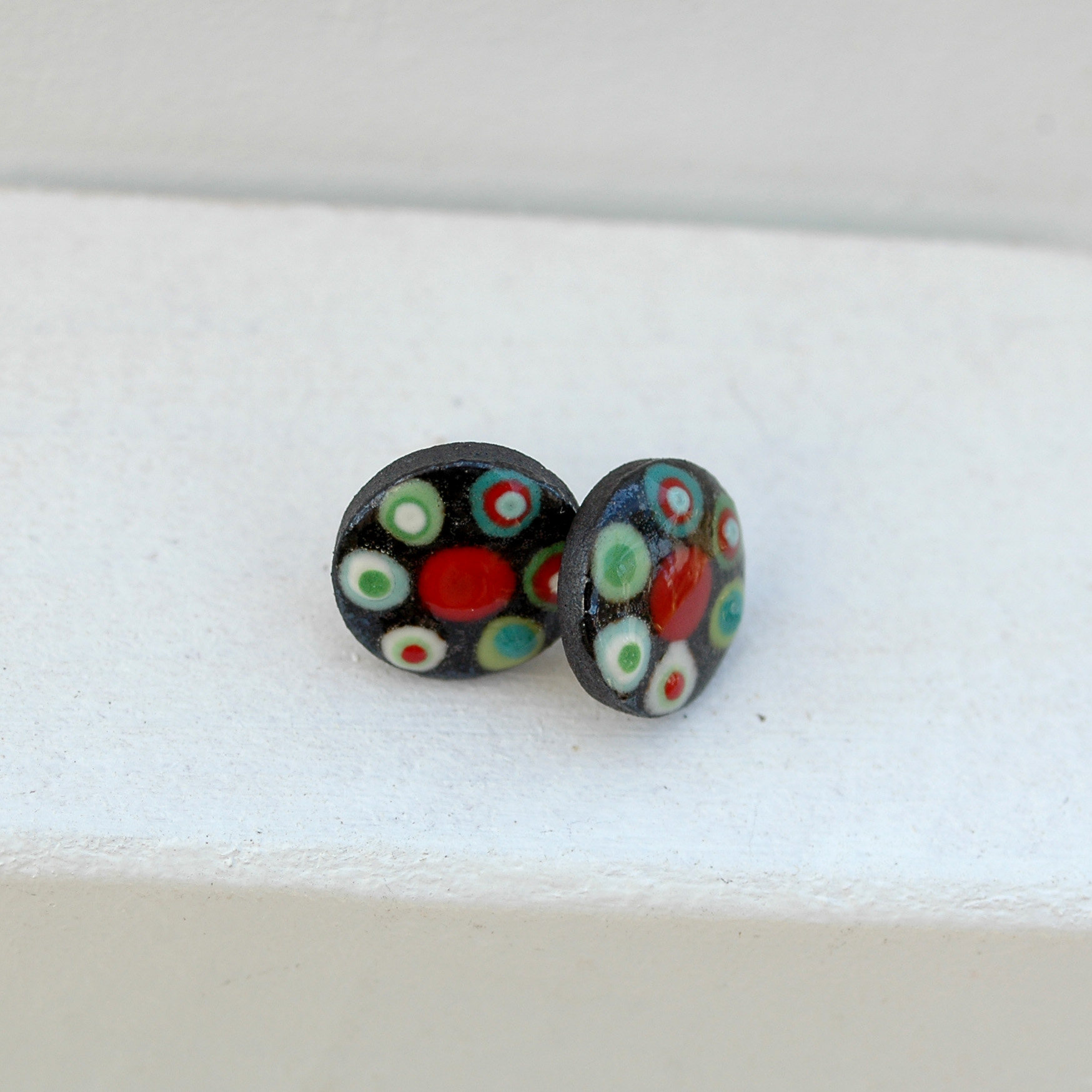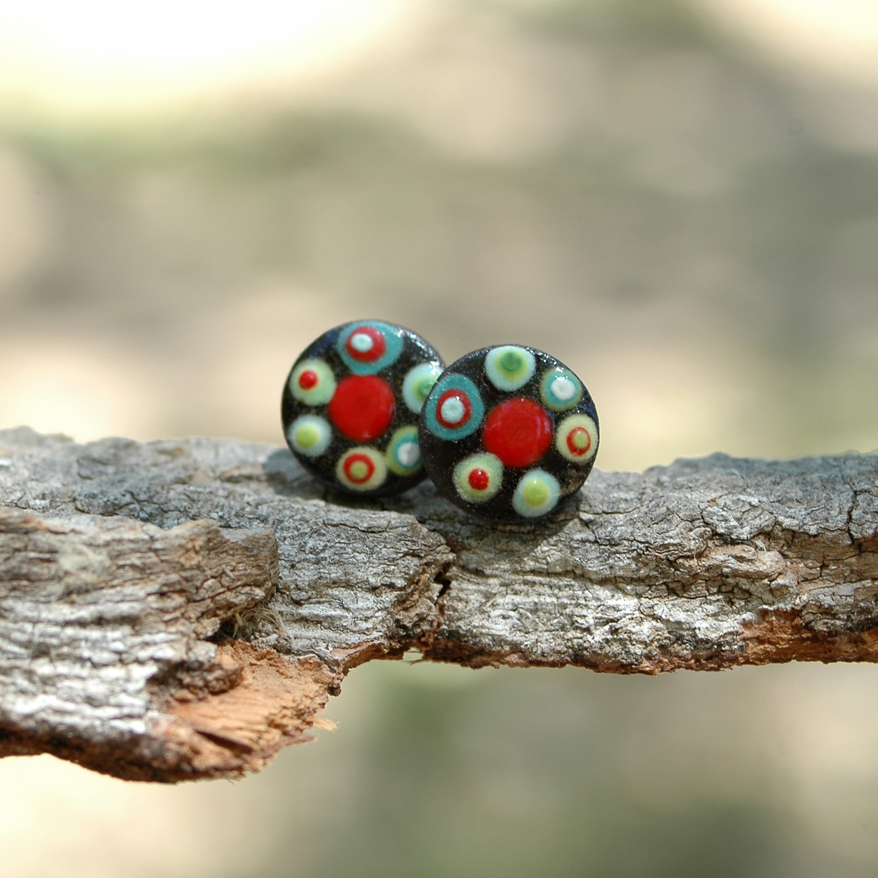 Originales pendientes pequeños con cierre de presión en plata de 1ª Ley. Son muy elegantes, en el fondo negro resaltan con alegría los colores verde y rojo. Cuando los lleves puestos se iluminará tu cara y te llenarán de energía. Son joyas únicas y llenas de amor. No te cansarás de llevarlos todos los días. Los metales (palito y tuerca) son de plata hipoalergénica, así evitarás que te hagan daño y los podrás disfrutar con tranquilidad.