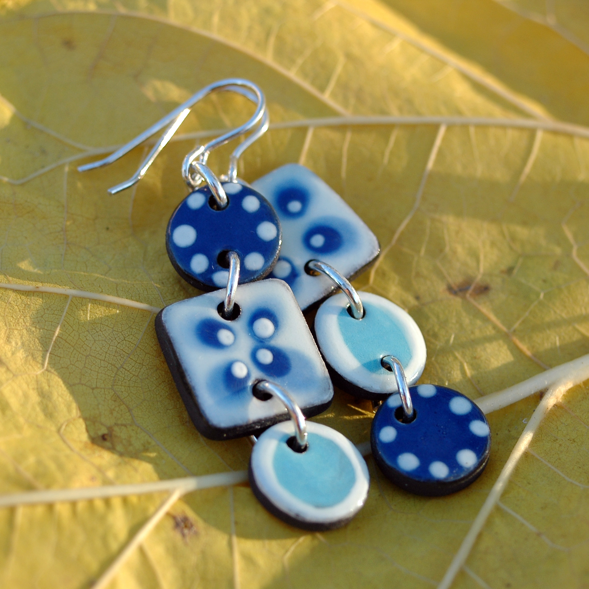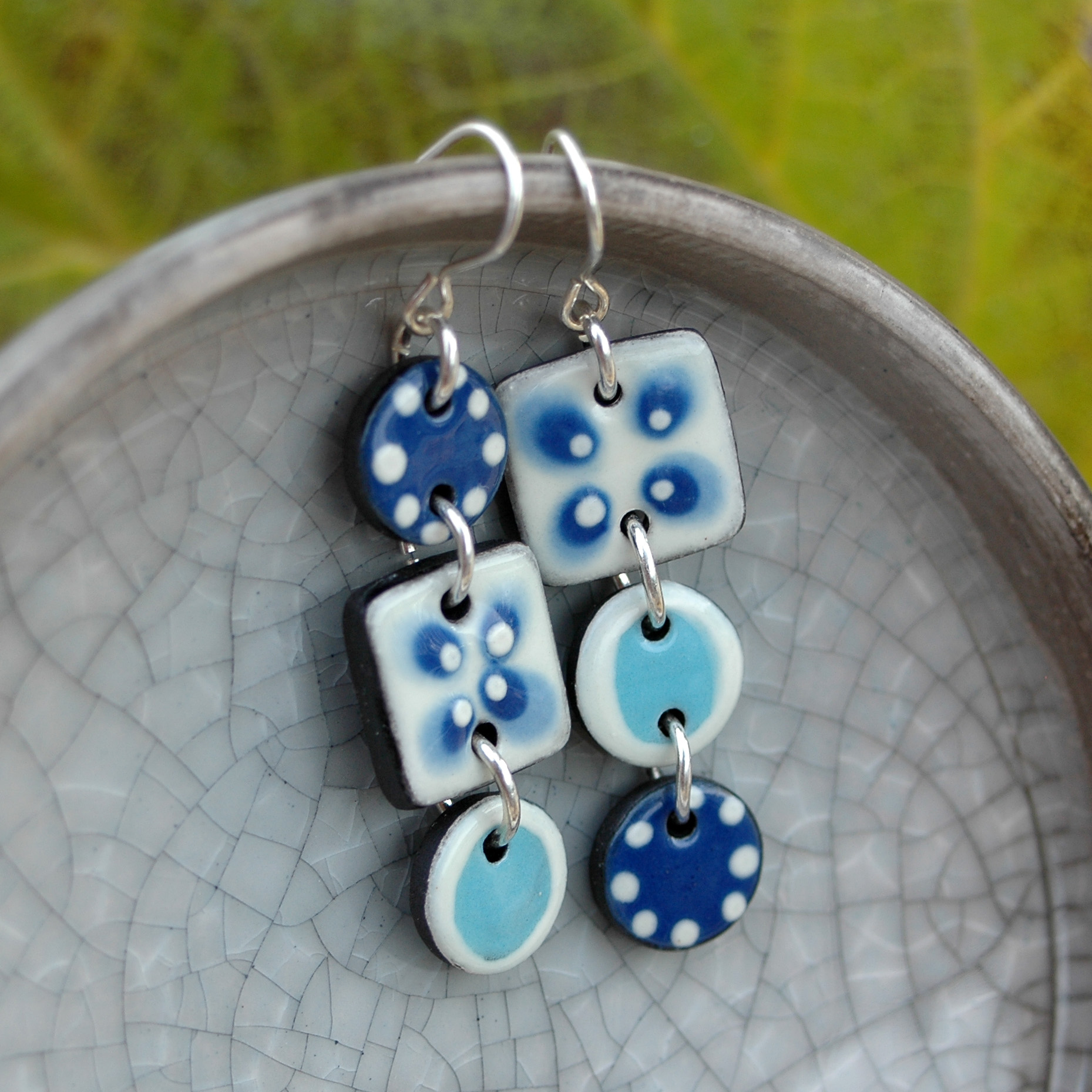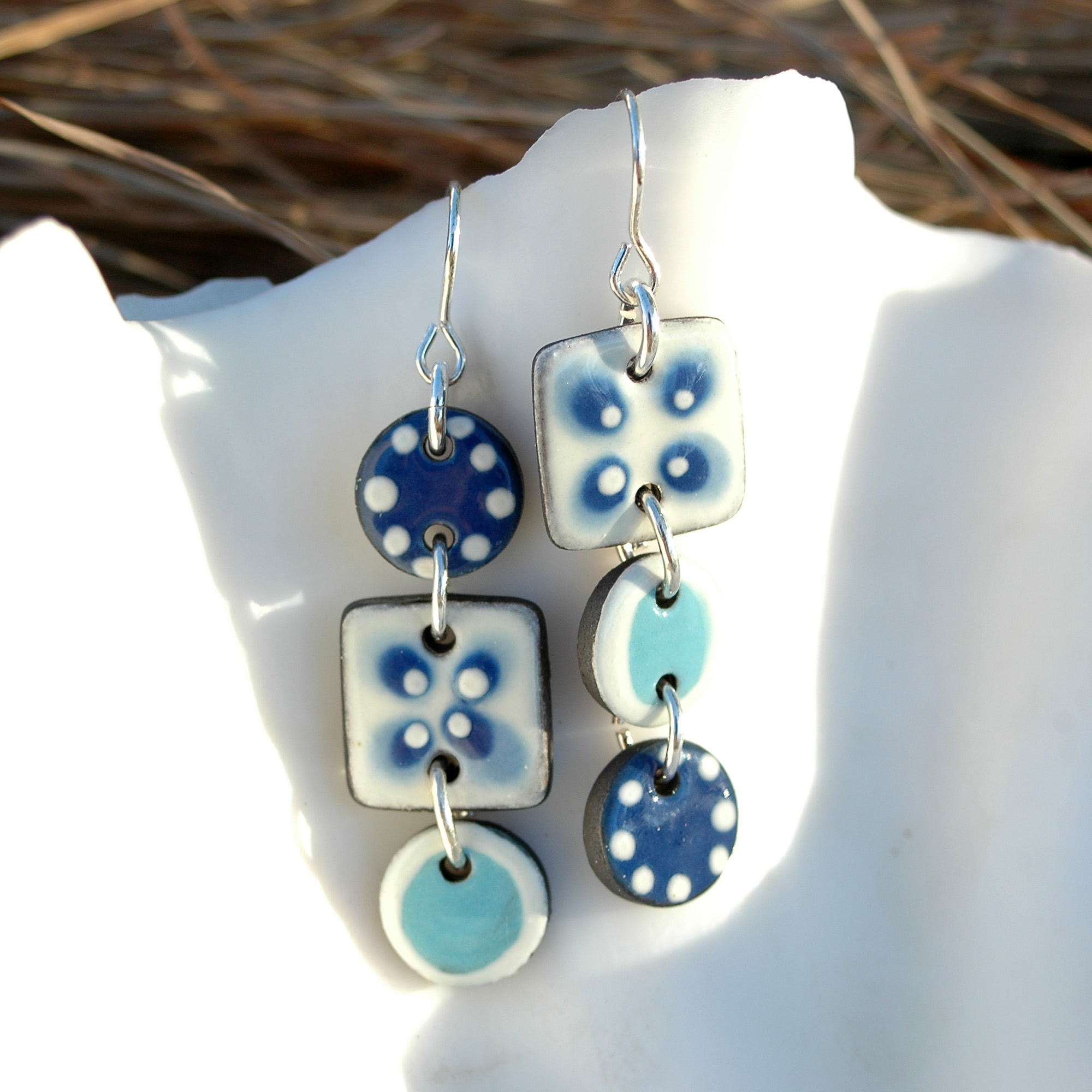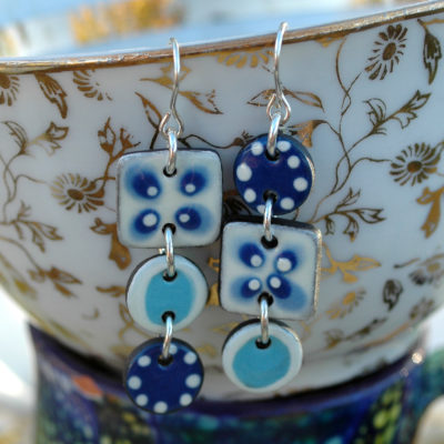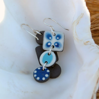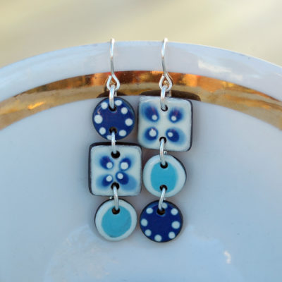 Pendientes largos en azul y blanco de cerámica.