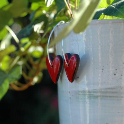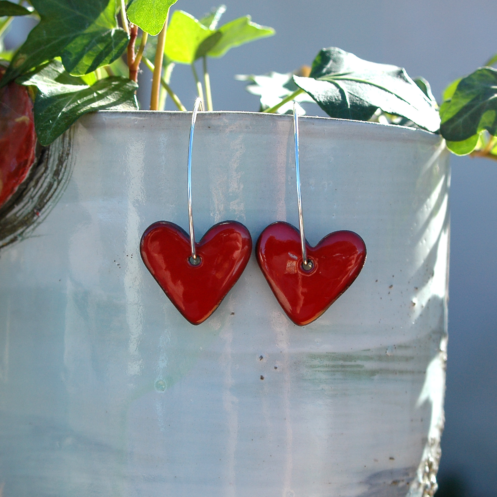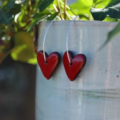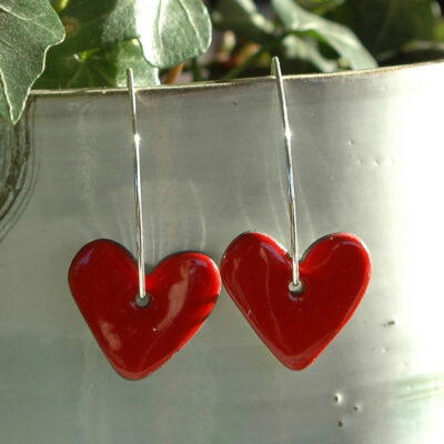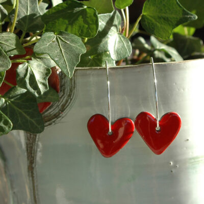 Pendientes Corazón Rojo de cerámica con gancho de plata largo.