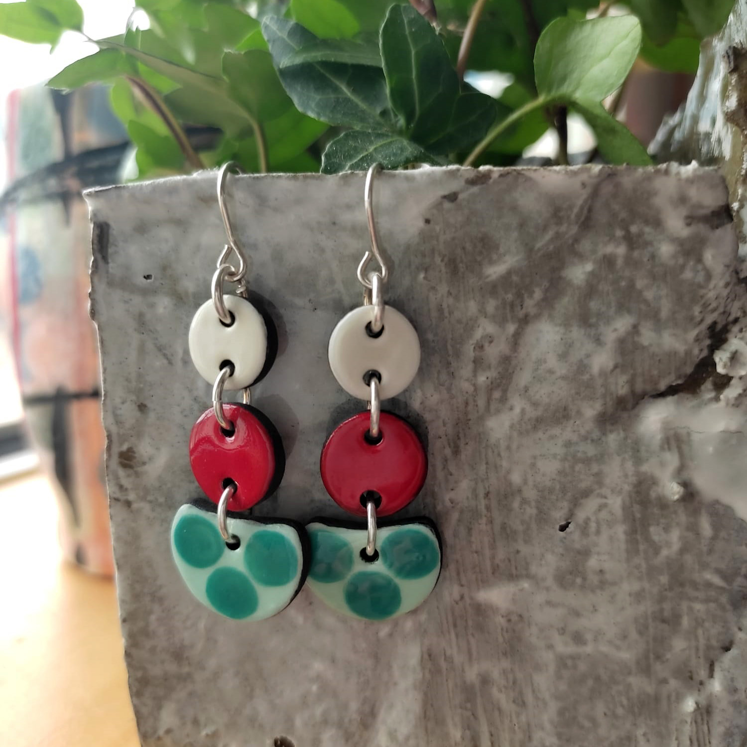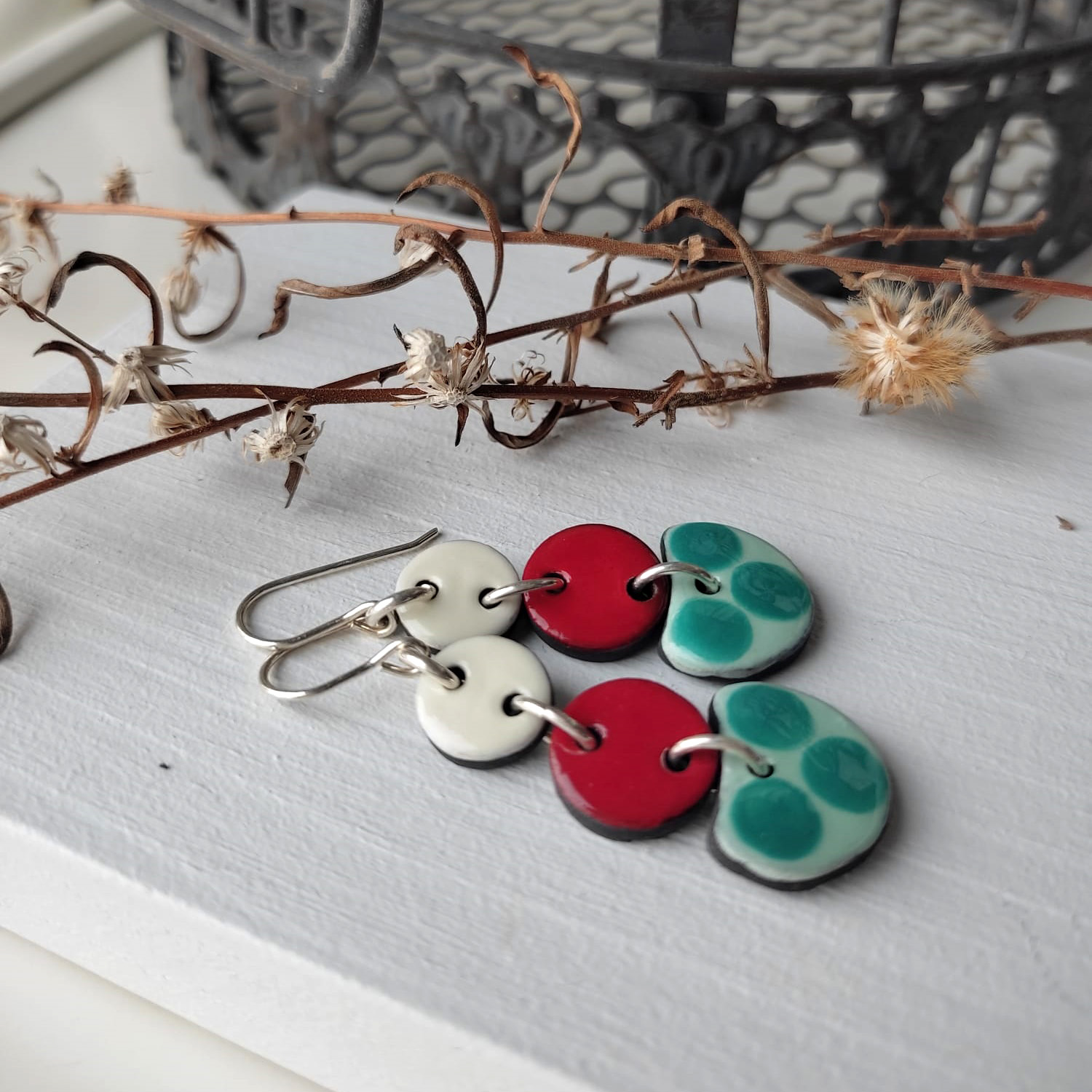Pendientes largos de tres piezas en Rojo, Blanco y Verde Turquesa.