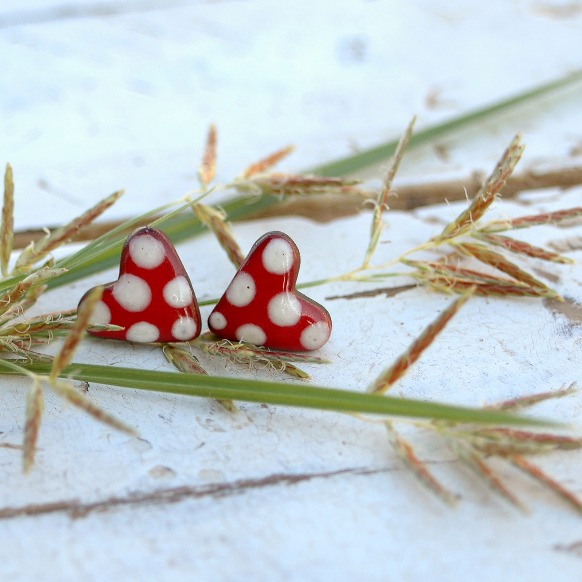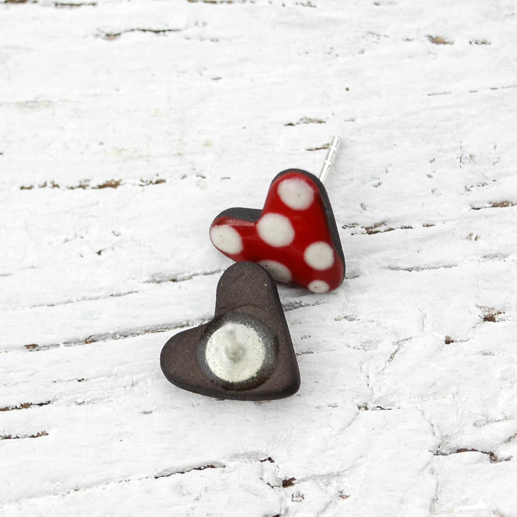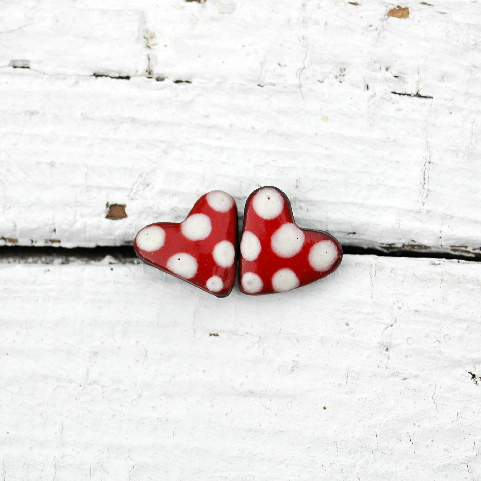 Alegres pendientes de corazón rojo y lunares blancos. Sistema de cierre de presión en plata de primera Ley, cómodos y de uso diario.