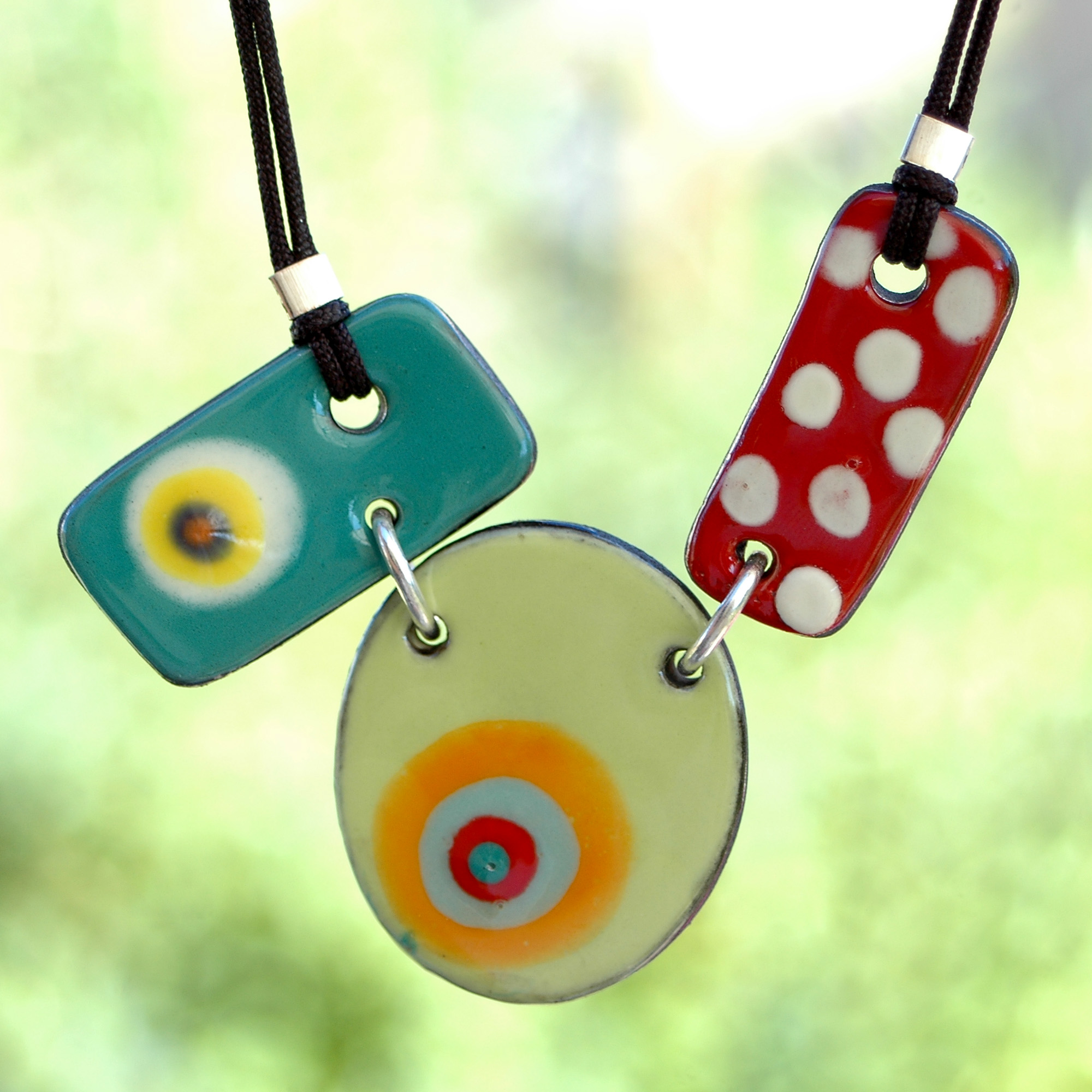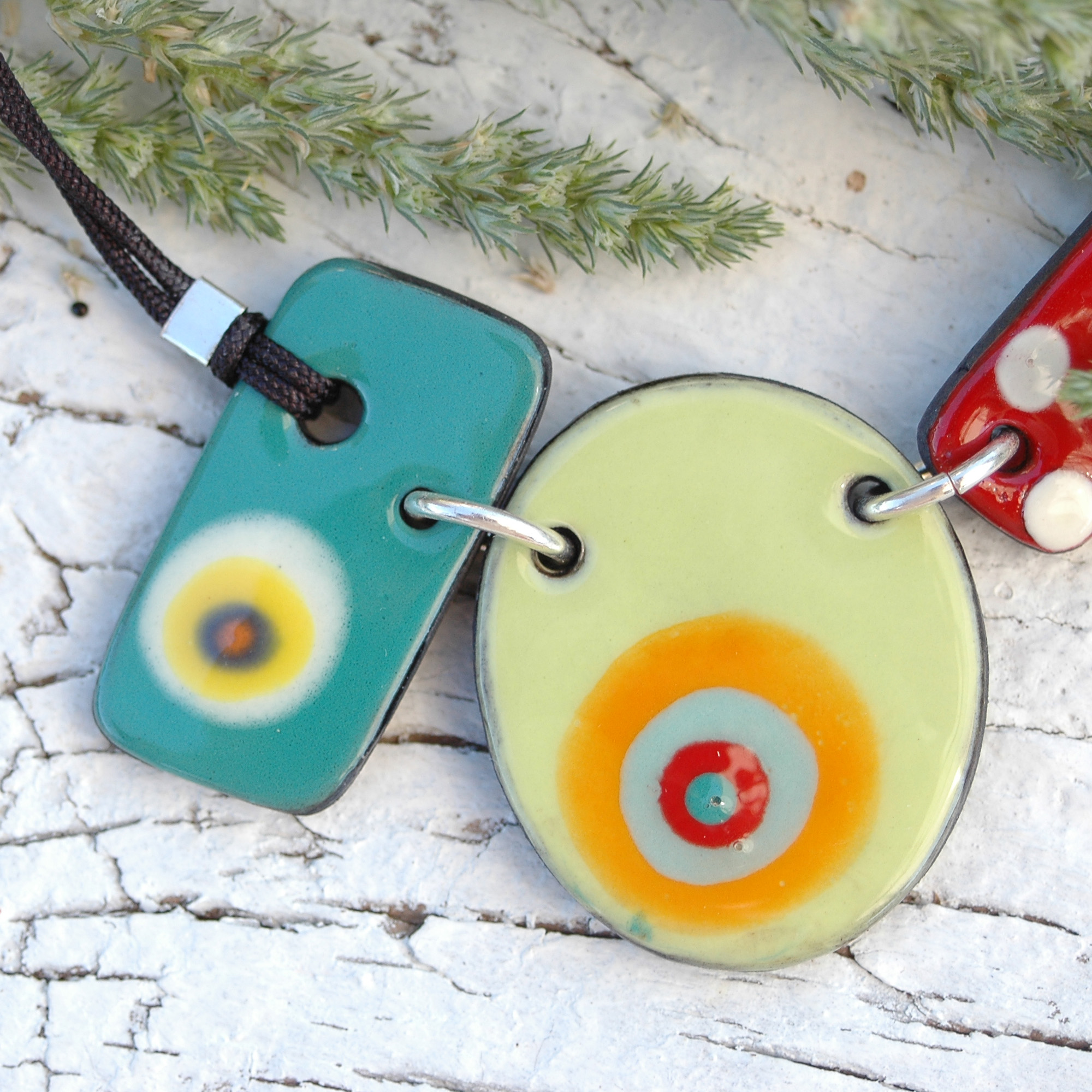 Este collar es ajustable, podrás llevarlo como collar o como gargantilla. Es original, liviano y muy creativo. Combinan las formas geométricas con los estilos psicodélico y mediterráneo. Las tres piezas están unidas mediante anillas de plata de 1,5 mm de espesor. El sistema de cierre está compuesto por una bola de plata que se desliza por el cordón de nylon hasta dejarlo a la altura que desees. Es una joya preciosa para lucirla en tu escote y llamará la atención de quien la mire. El estilo es atemporal y no te cansarás de lucirla. ¿Te atreves?
