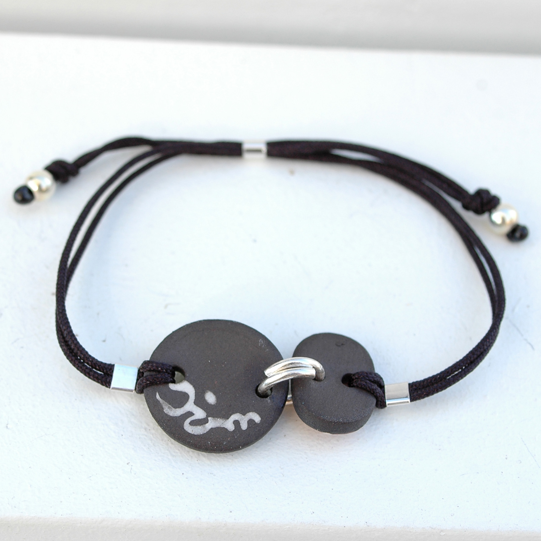 Compuesta por refrescantes piezas redondas unidas por una anilla de plata. El cordón es de nailon y tiene pequeñas bolitas de plata en los extremos.