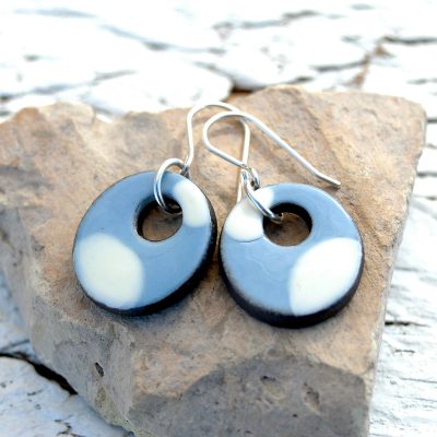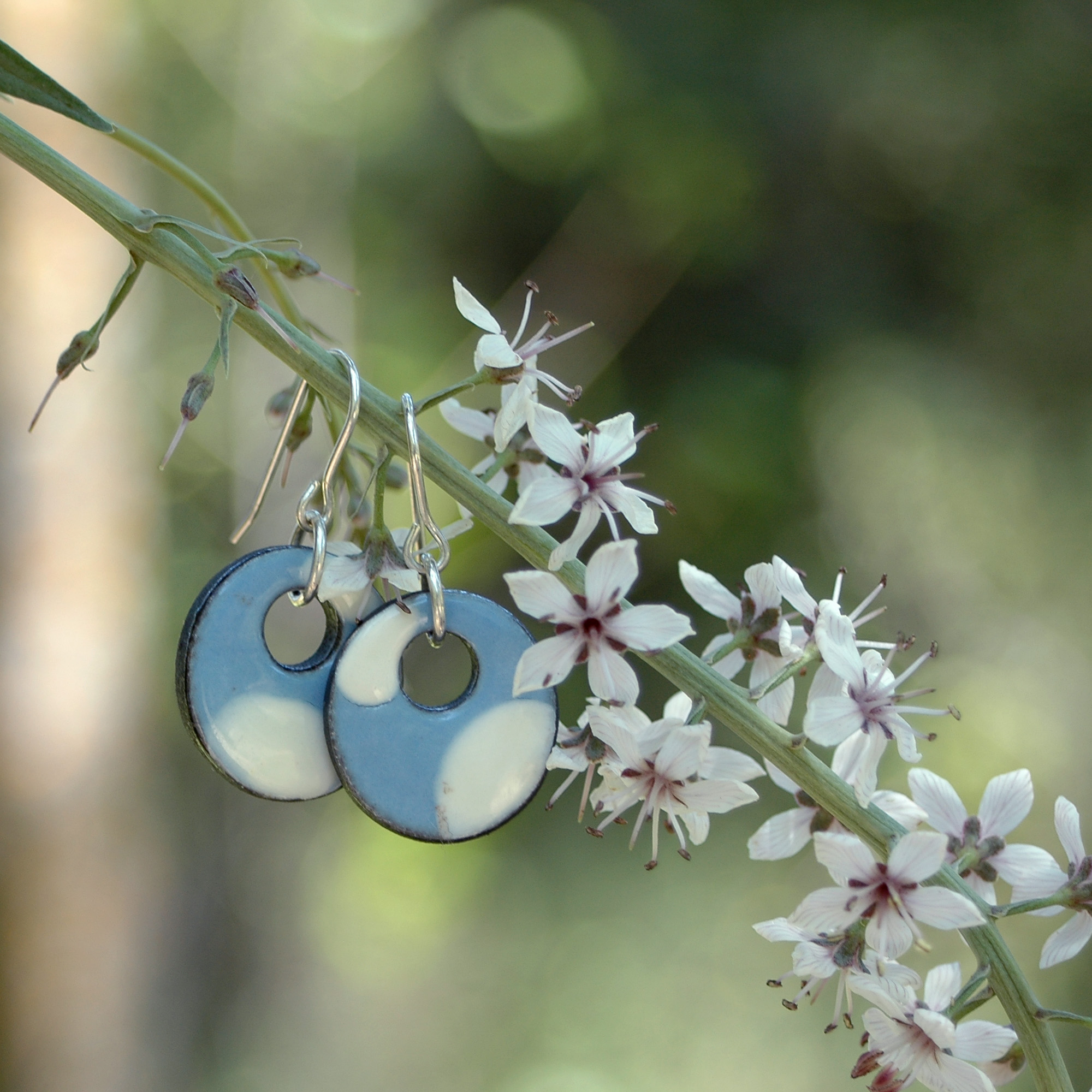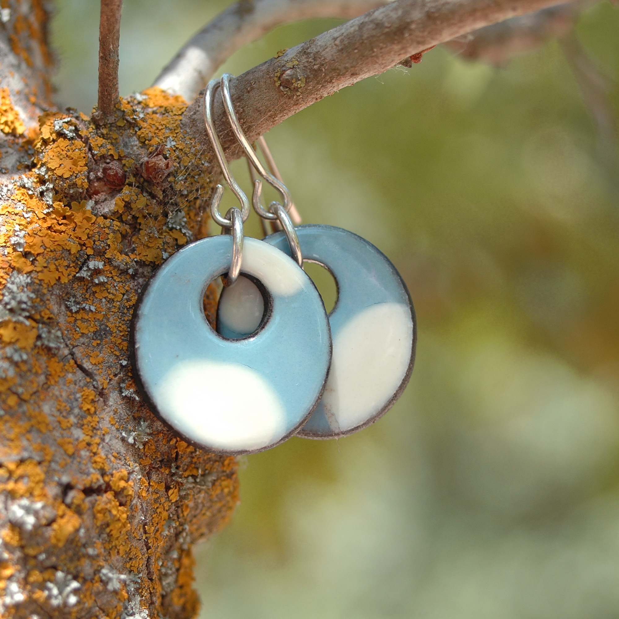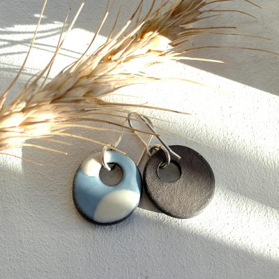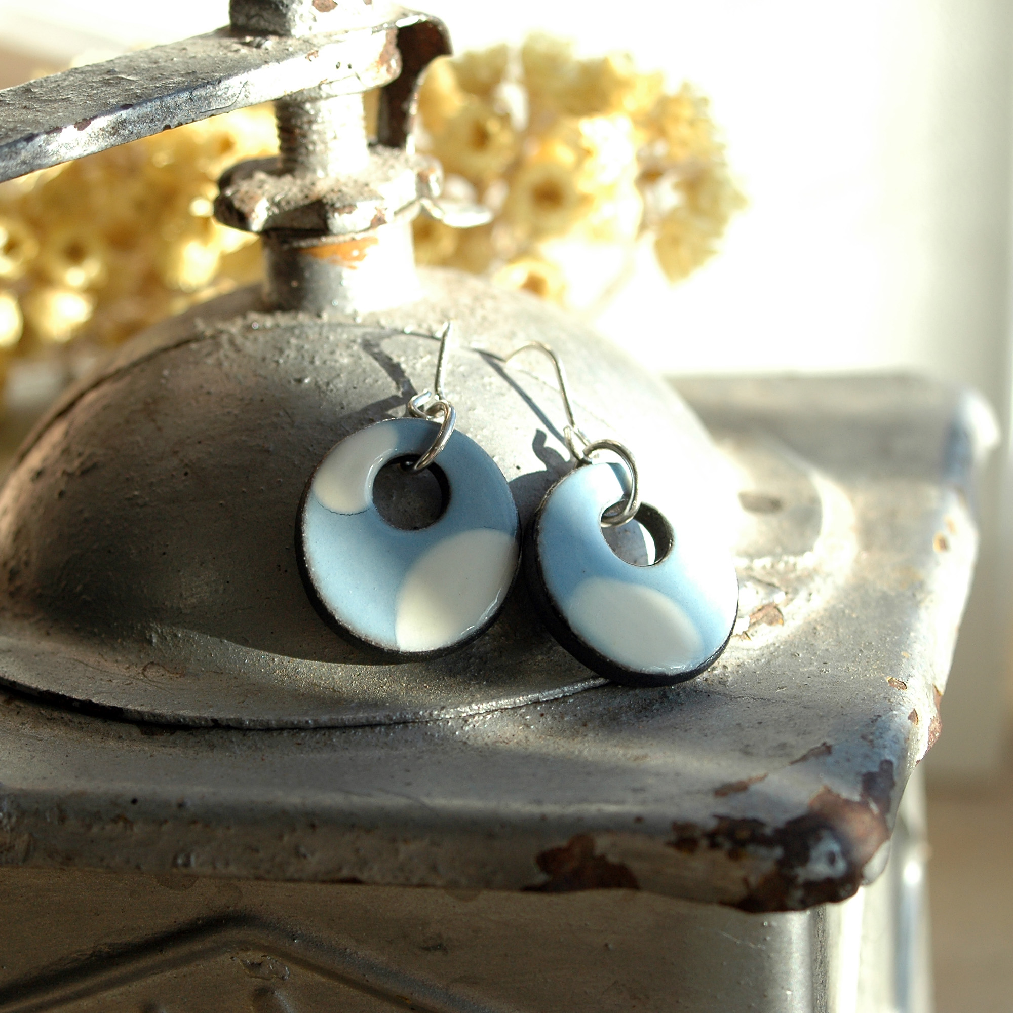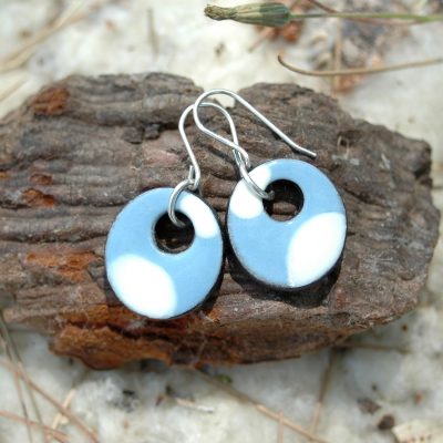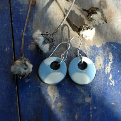 Pendiente ovalado de una pieza en color azul claro y blanco. Metales: Plata de Ley.