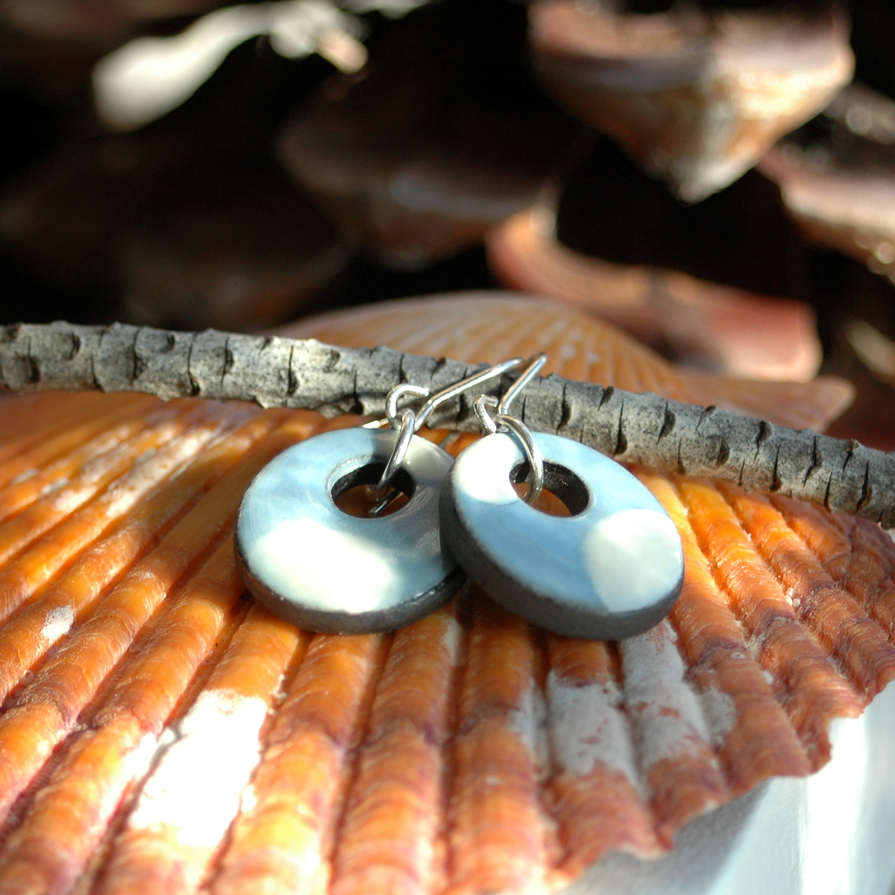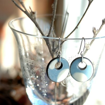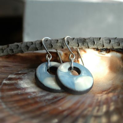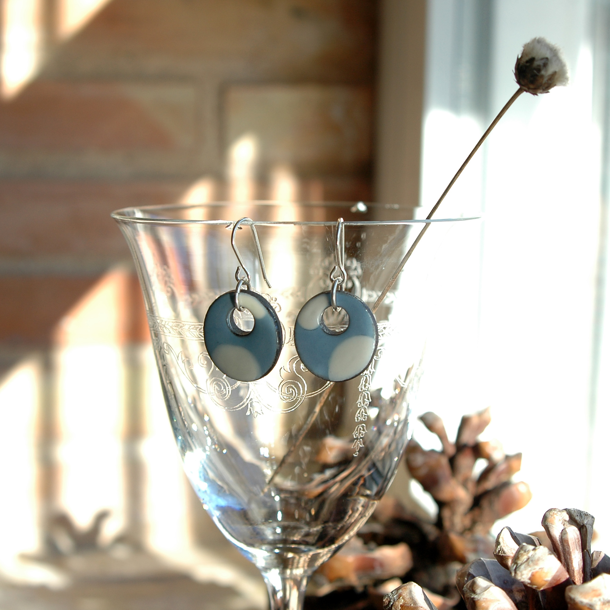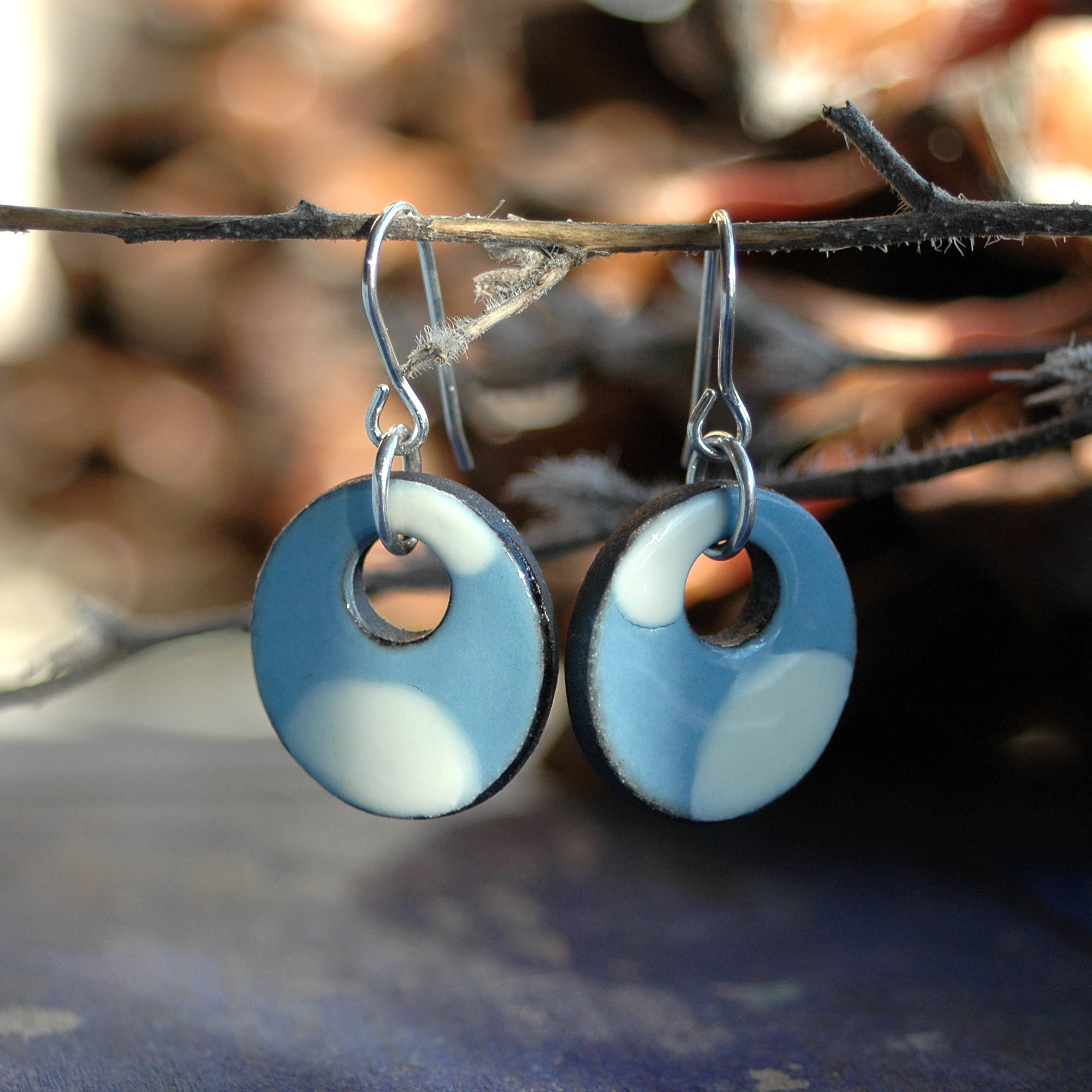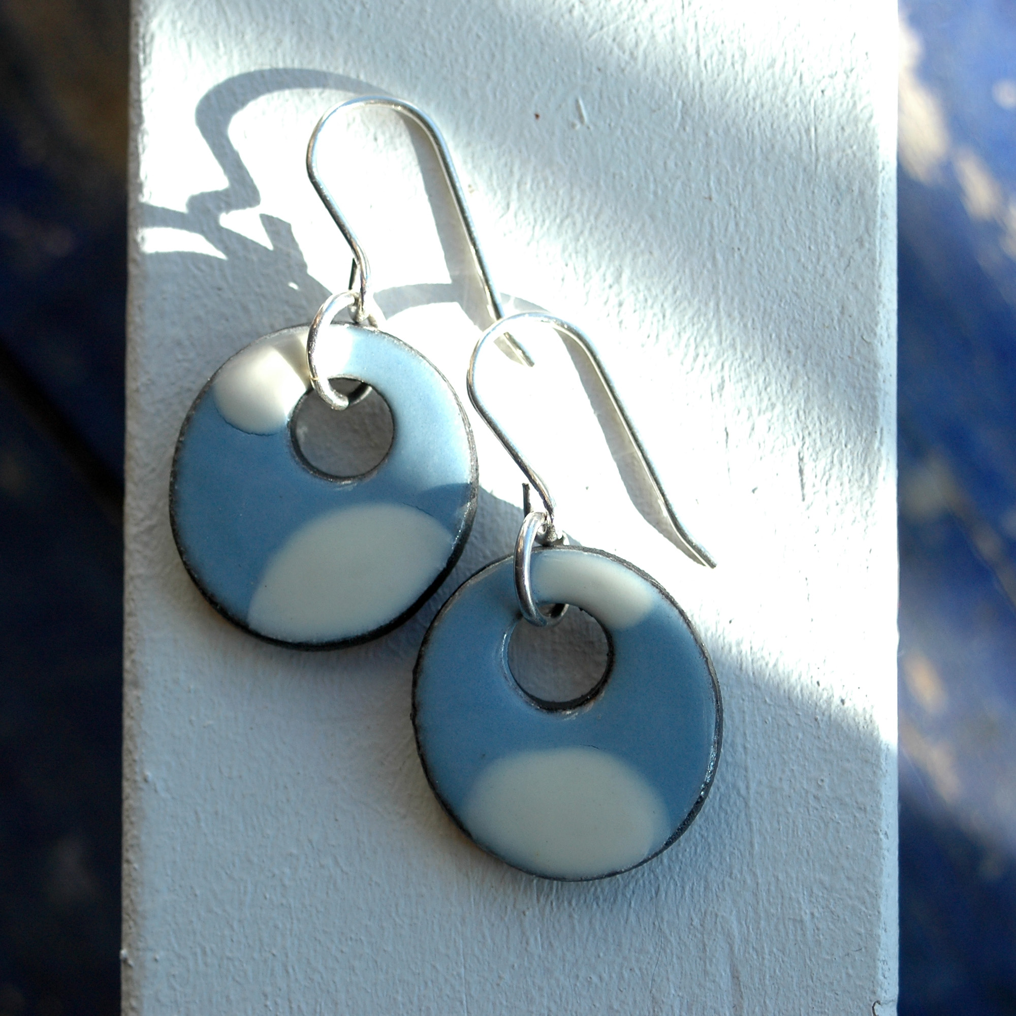 Pendiente ovalado de una pieza en color azul claro y blanco. Metales: Plata de Ley.