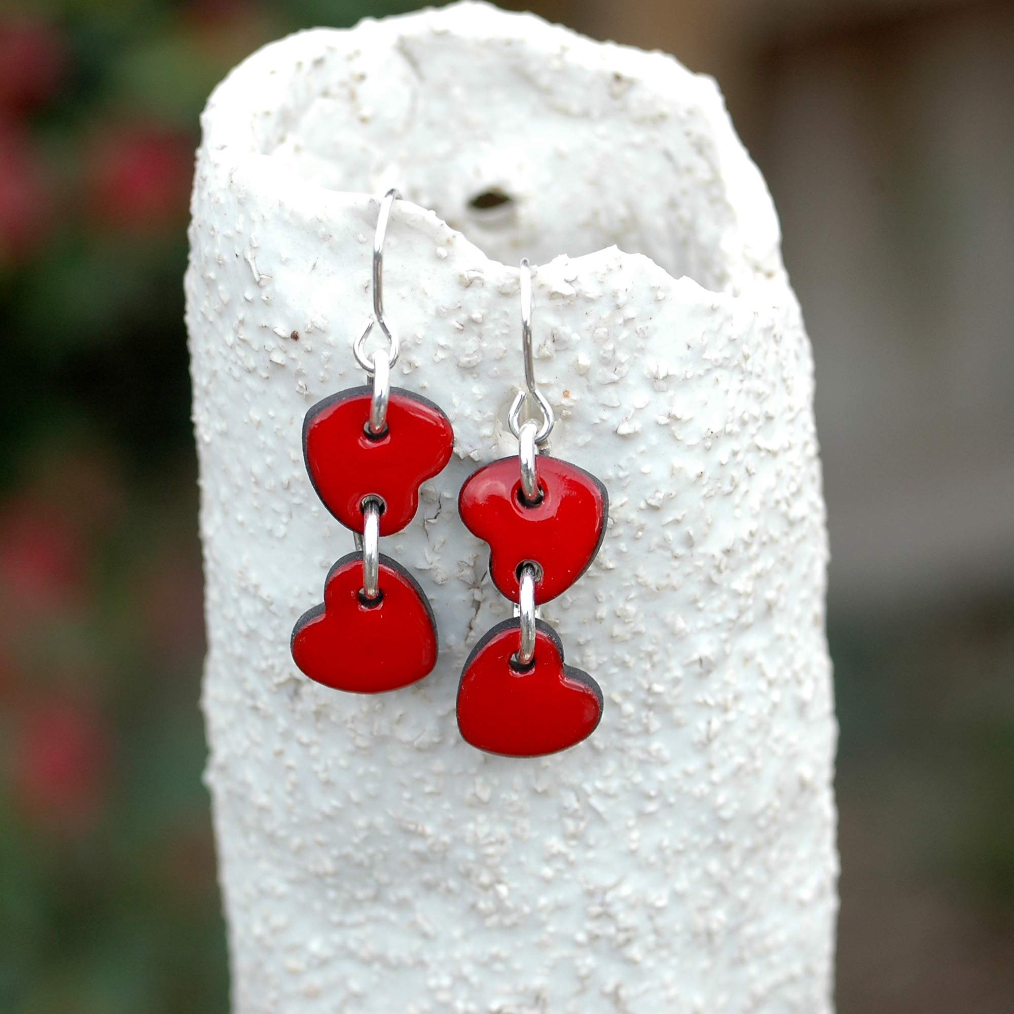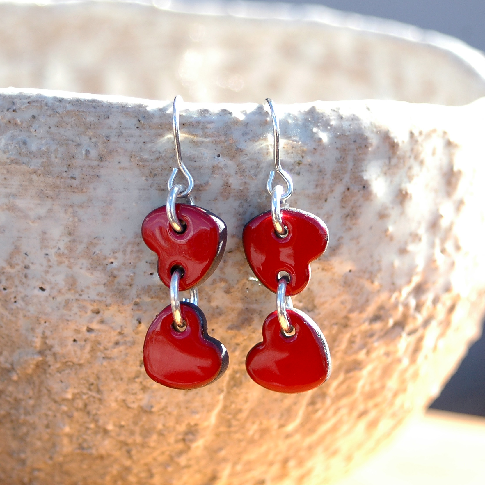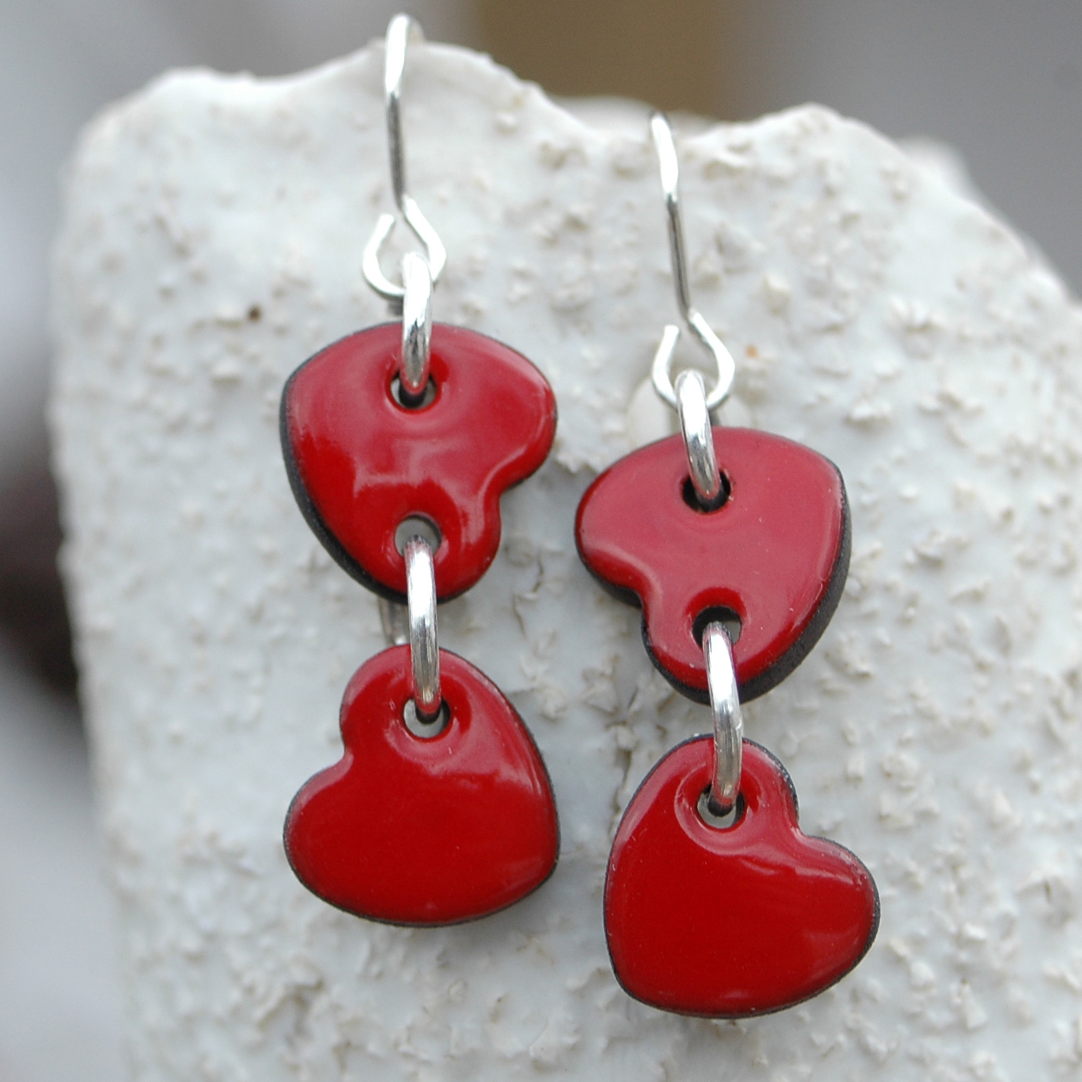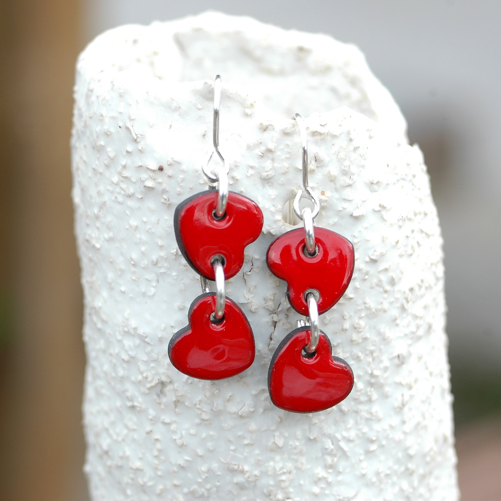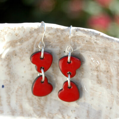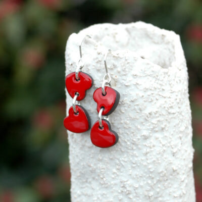 Pendientes dobles de corazónes rojos pequeñitos.
